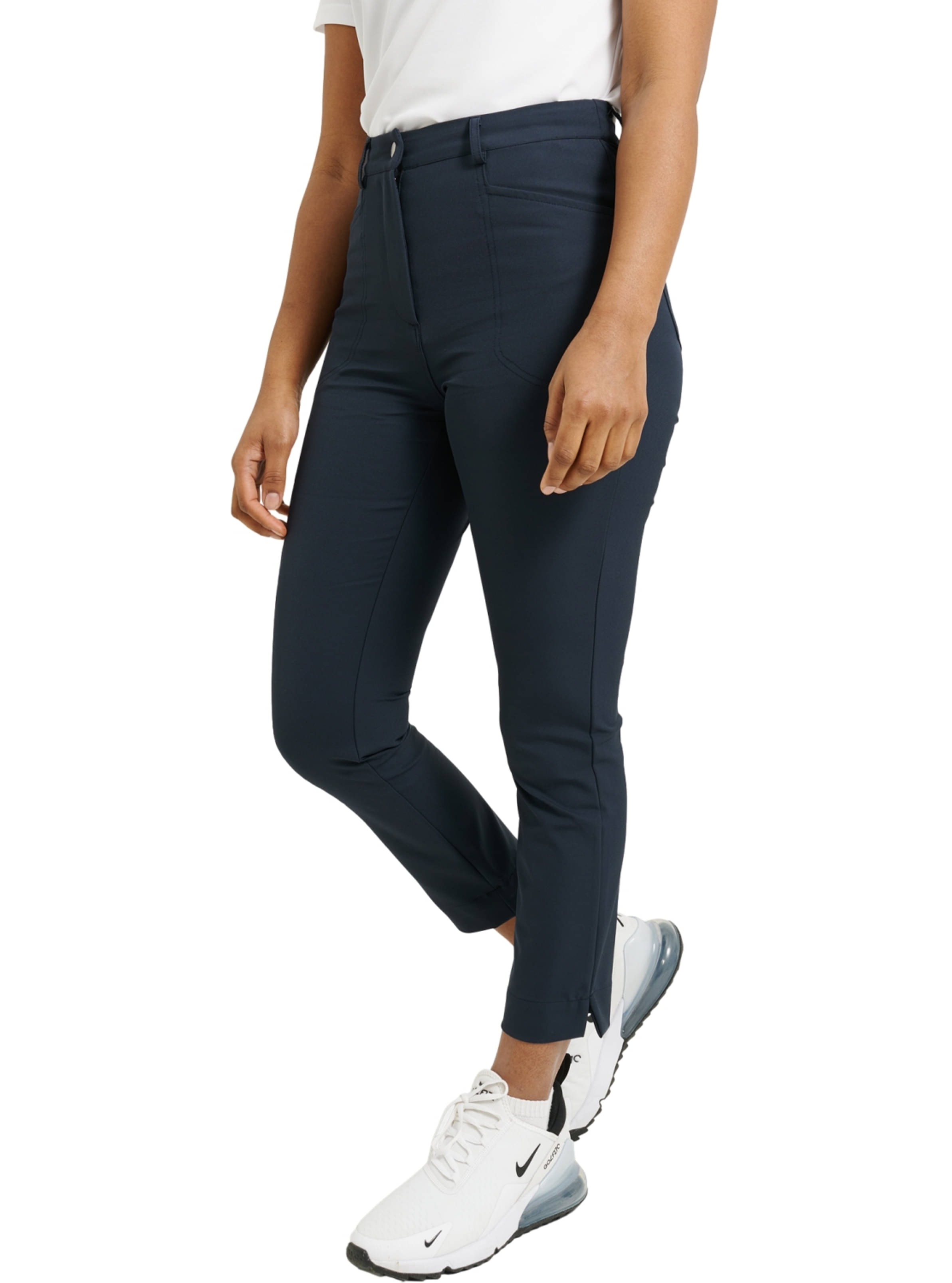 Die Abacus Hose Elite 7/8 ist aus einem funktionellen Material gefertigt, das 4-Wege-Stretch bietet und gleichzeitig äußerst atmungsaktiv ist. Der Stoff verfügt über Drycool- und Feuchtigkeitstransport-Eigenschaften, die dich auch an aktiven Tagen angenehm trocken halten. Mit einem femininen Schnitt und einer etwas kürzeren Länge ist diese Hose sowohl auf dem Golfplatz als auch im Alltag die perfekte Wahl. Ausgestattet mit einem Frontreißverschluss, zwei vorderen und zwei hinteren Taschen sowie Gürtelschlaufen für einen optimalen Sitz. Die Innenbeinlänge beträgt 66 cm in Größe 38.
