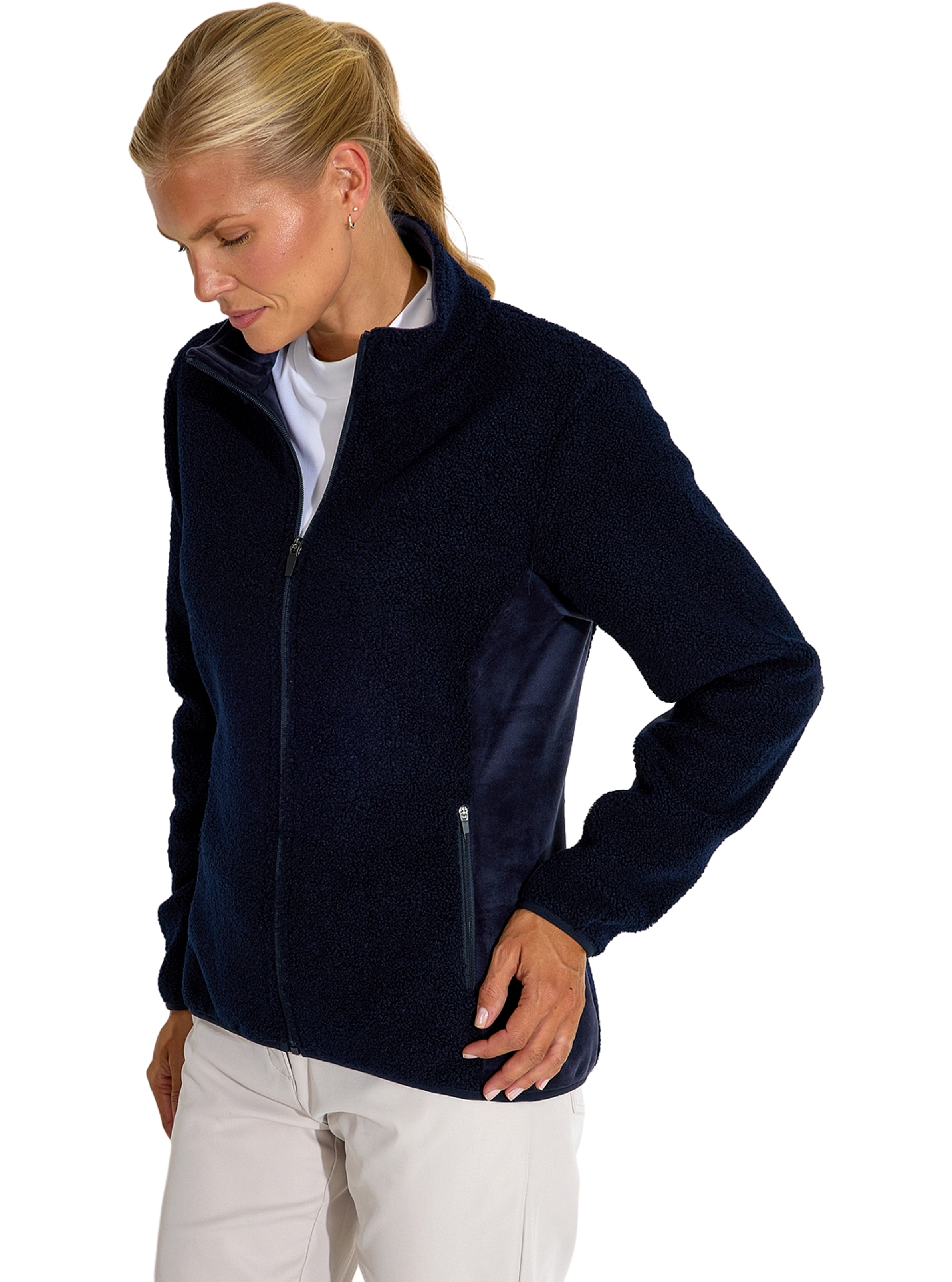 Der Highlands Midlayer besteht aus einem reichhaltigen und warmen Polyester-Teddy mit weichem Samtfleece auf der Innenseite und an den Seitenteilen. Die Jacke bietet zusätzliche Wärme an kalten oder windigen Tagen. Sie verfügt über einen durchgehenden Reißverschluss vorne und zwei Fronttaschen mit Reißverschlüssen. Das Abacus-Logo befindet sich unten links und hinten unter dem Kragen.