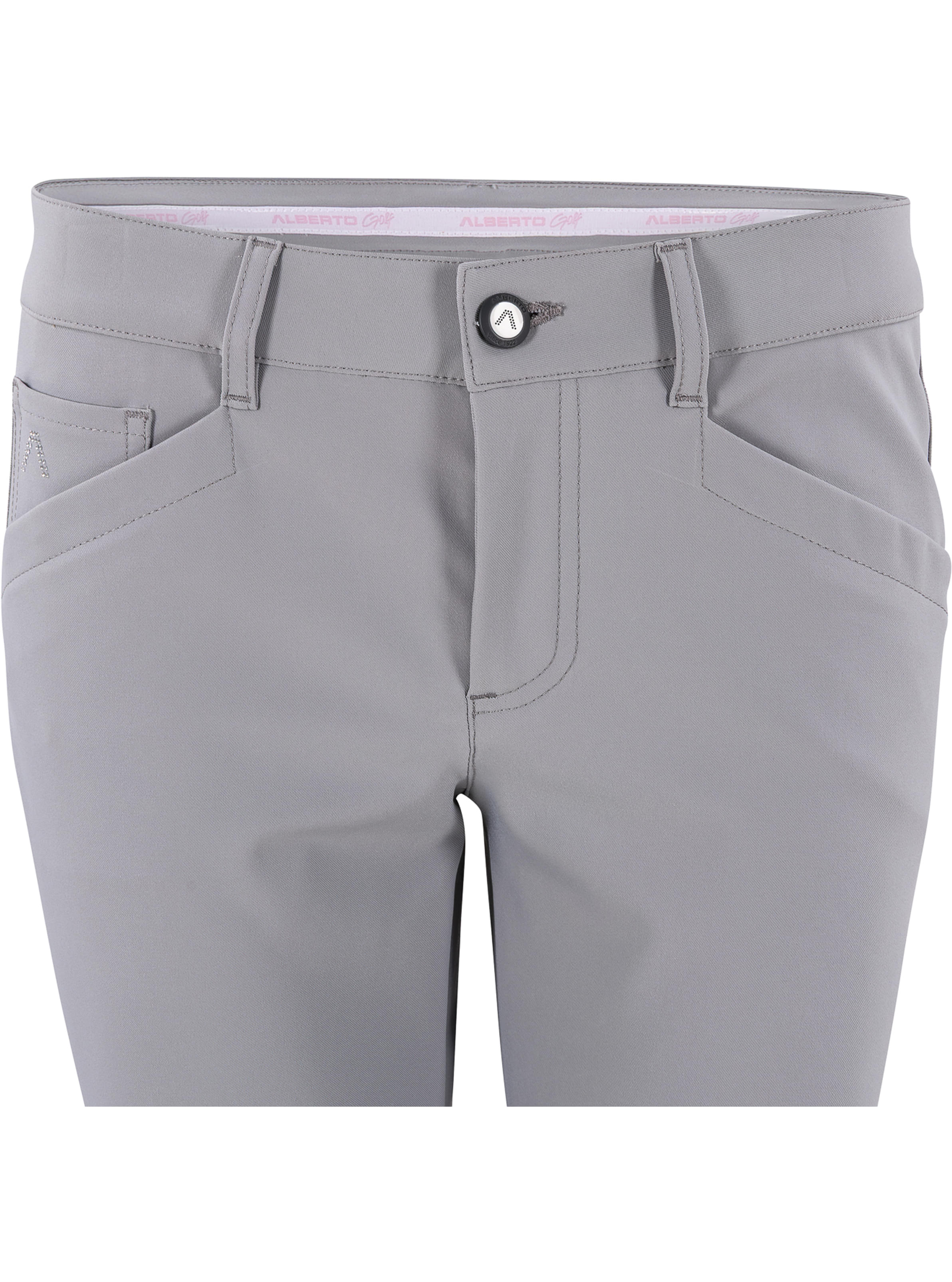 Die Alberto Golfhose Jana im Stoff FX4 Dry Cooler überzeugt durch ihre moderne Passform mit regulärer Taille und schmalem Beinverlauf. Der innovative Stoff bietet ein angenehm leichtes Tragegefühl und optimale Bewegungsfreiheit – ideal für aktive Golferinnen bei warmem Wetter.