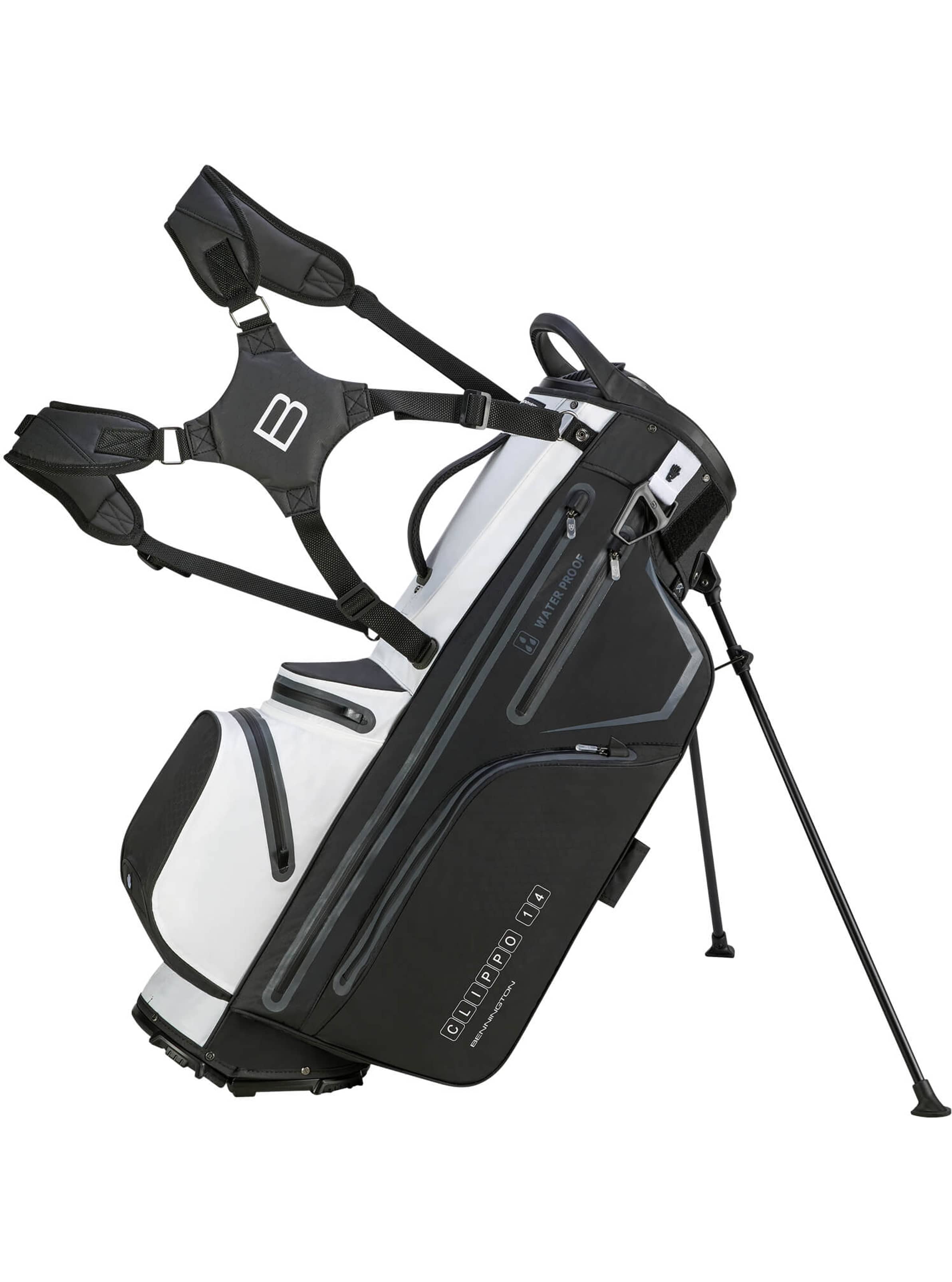 Wenn Sie die Ruhe auf dem Golfplatz schätzen, dann werden sie das Bennington Clippo 14 Standbag lieben! Mit dem Organizer-System führt Bennington die Clip-Lok-Vorrichtung gegen das lästige Schlägerklappern nun auch für die Standbags ein. Dieses hält die Schläger an Ort und stelle fest und verhindert, dass diese Lärm verbreiten und hilft zudem auch die Schläger vor kleinen Schäden durch das Aneinanderschlagen zu schützen.