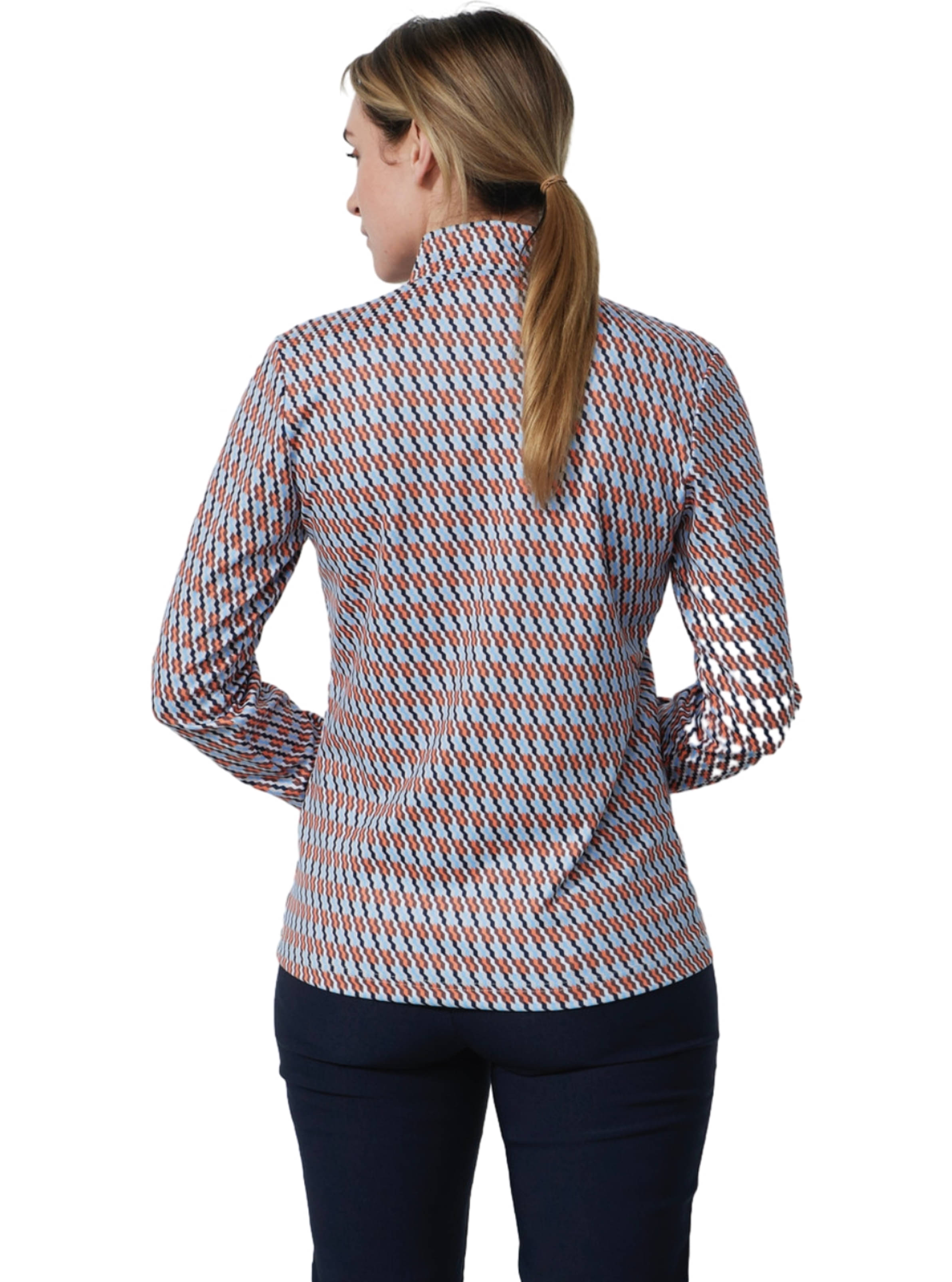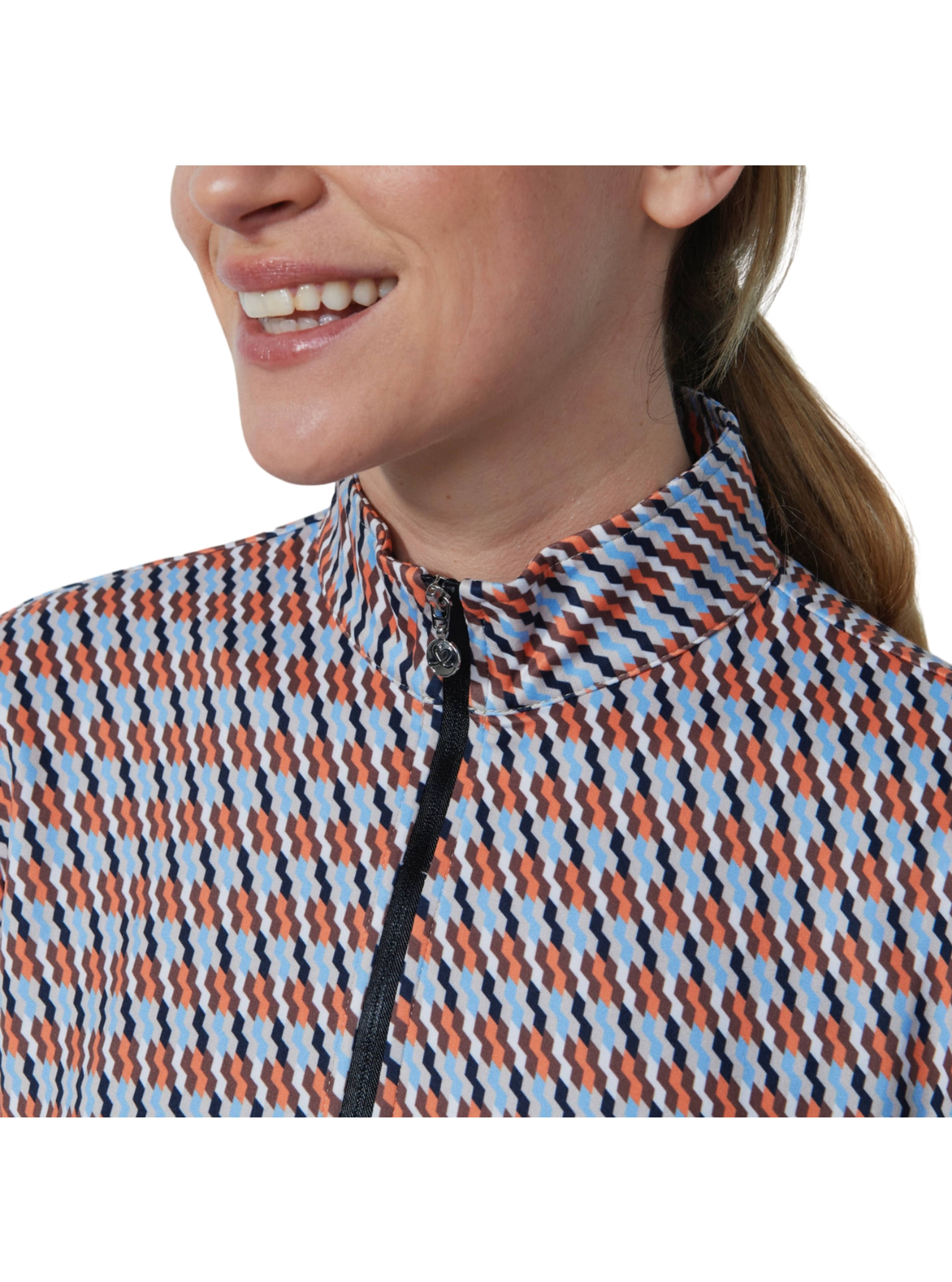 Das Daily Sports Layer Delta 1/4 Zip ist ein langärmliges Golfoberteil, das Stil und Funktionalität vereint. Das weiche, gebürstete Jersey-Material sorgt für angenehmen Tragekomfort, während das Stretch-Material und der Allover-Print für eine moderne Optik sorgen. Der Stehkragen und das schnelltrocknende Material machen dieses Oberteil zur idealen Wahl für aktive Golferinnen.
