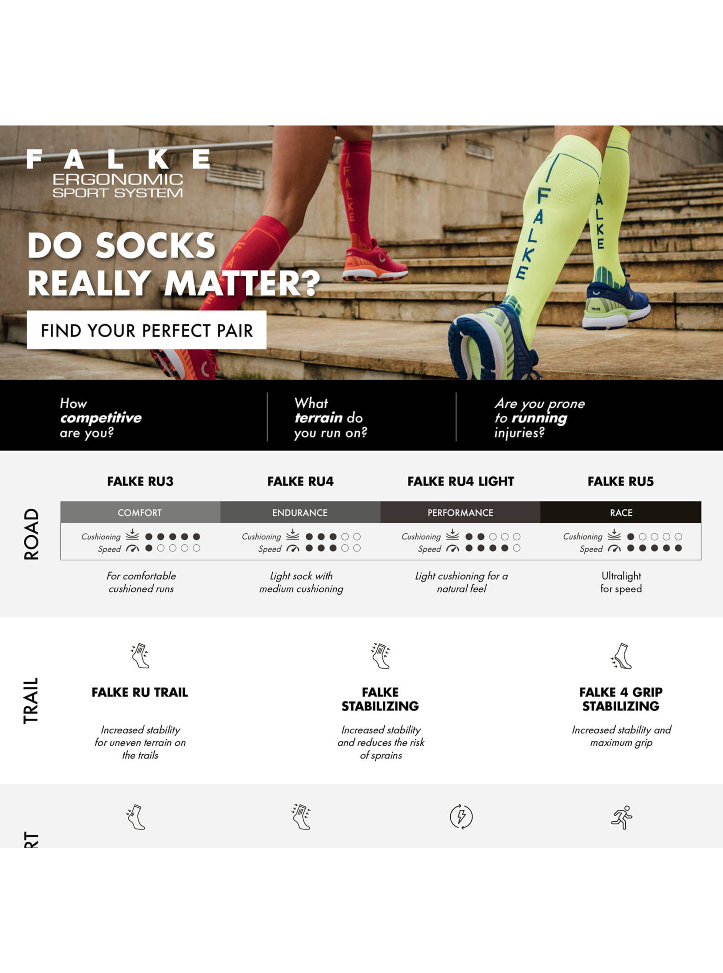 Der knöchellange "RU4 Light" eignet sich dank seiner dünnen Sohle perfekt für Läufer, die großen Wert auf direkte Kraftübertragung und unmittelbaren Schuhkontakt legen. Die leichte Polsterung reduziert Druckstellen und schätzt so vor Blasen. Ein schneller Feuchtigkeitstransport und die anatomische FALKE-Passform sorgen für hohen Tragekomfort und perfekten Sitz. Beste Voraussetzungen für einen erfolgreichen Wettkampf!