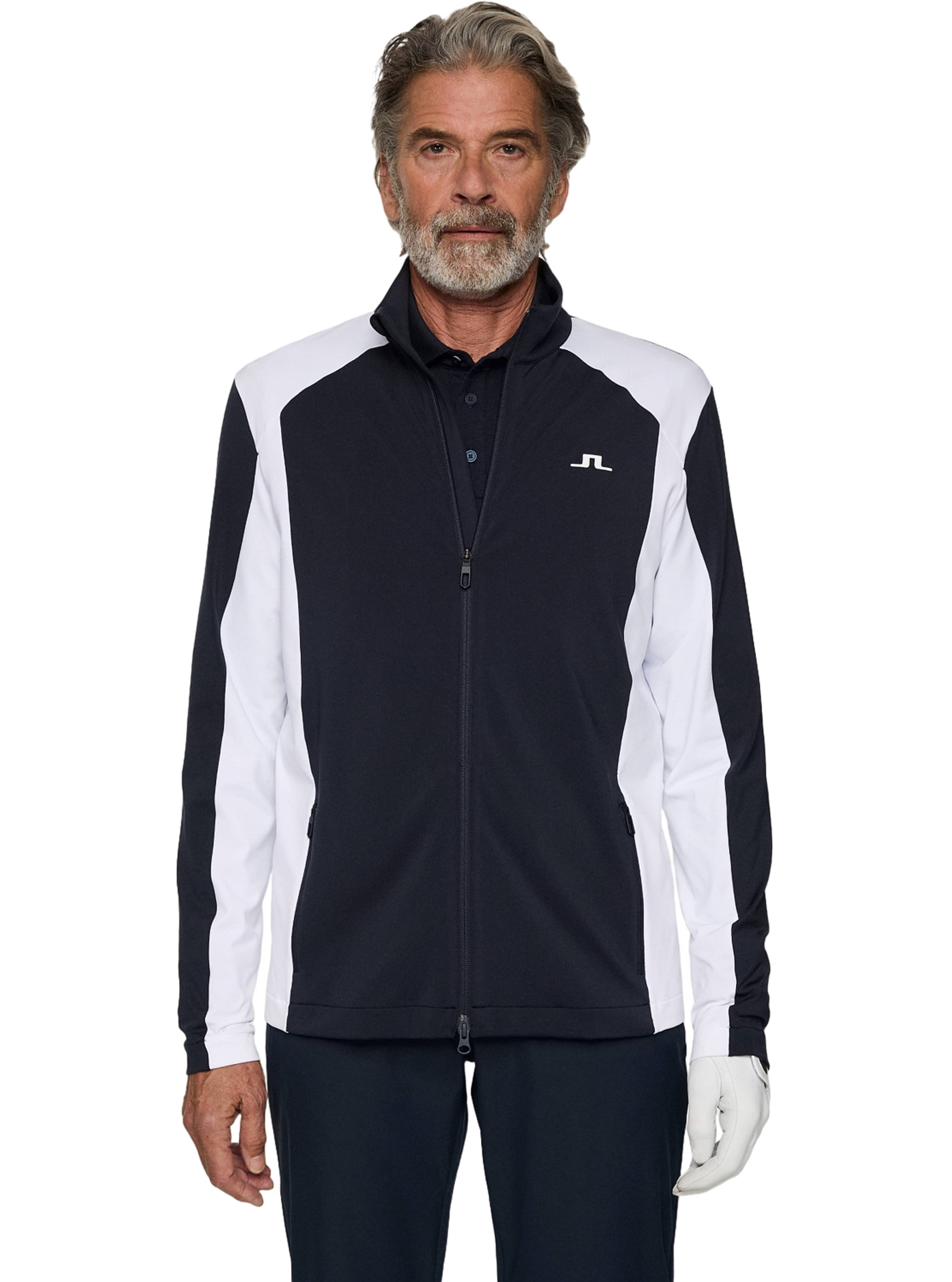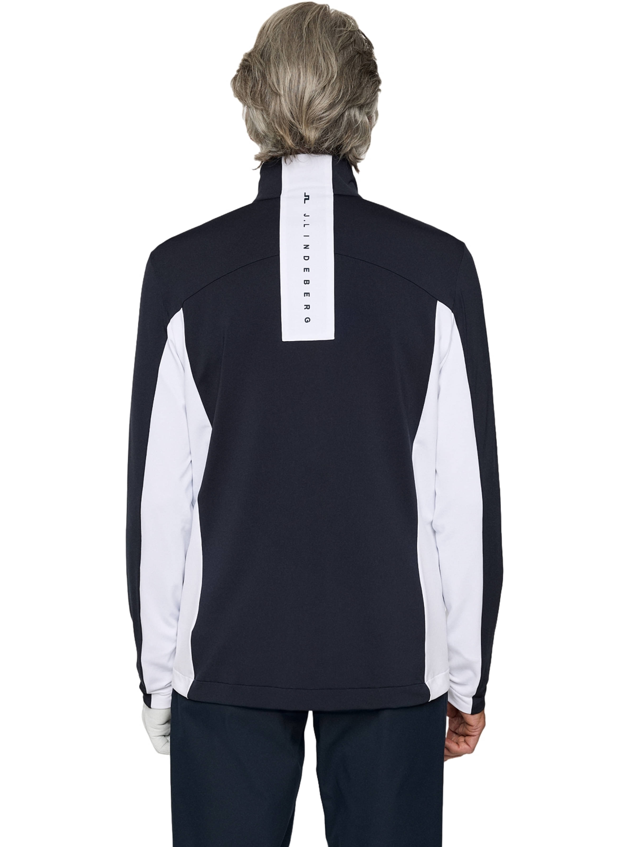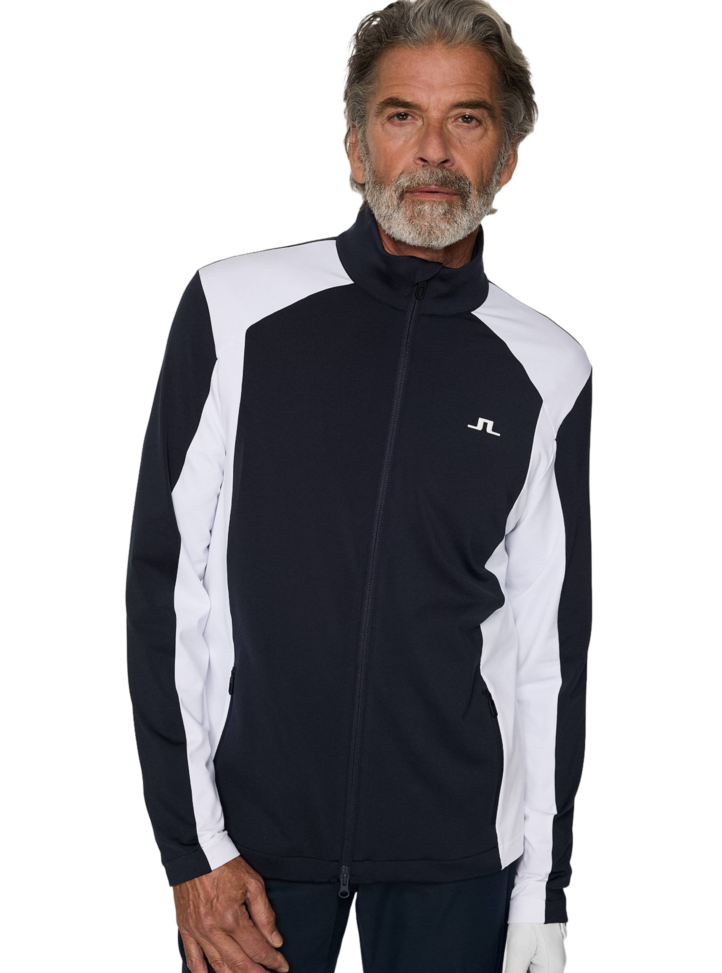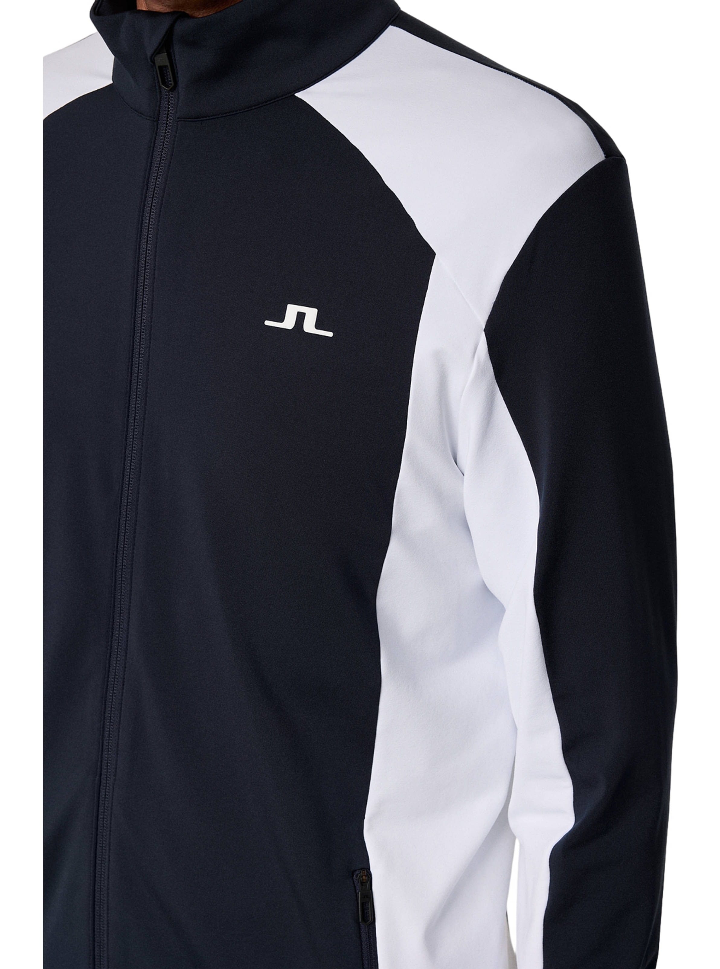 Das Banks Mid Layer von J.Lindeberg ist mit auffälligen, farblich abgesetzten Panels und J.Lindeberg-Logos gestaltet. Es eignet sich sowohl für die Skipiste als auch für den Golfplatz.