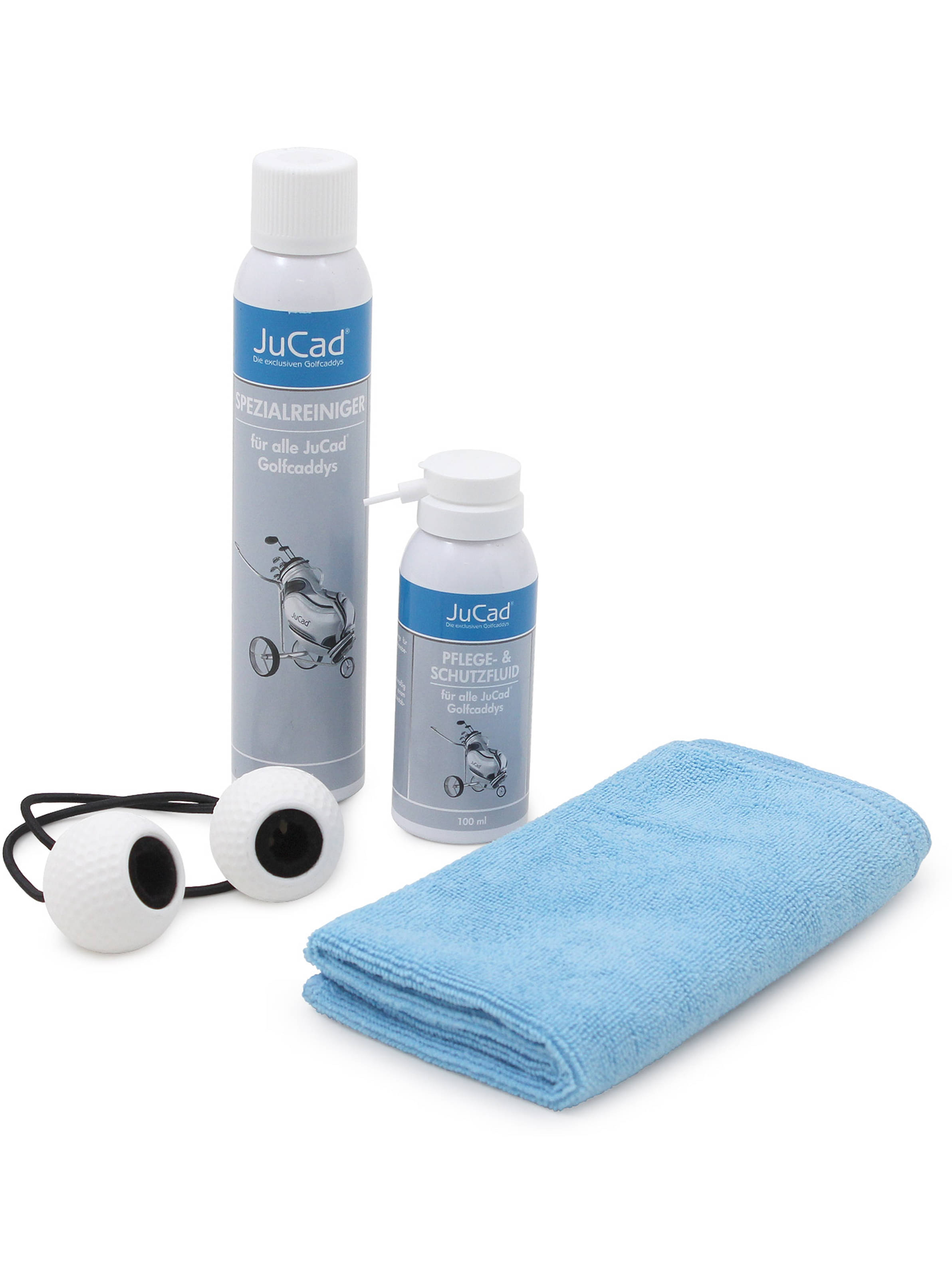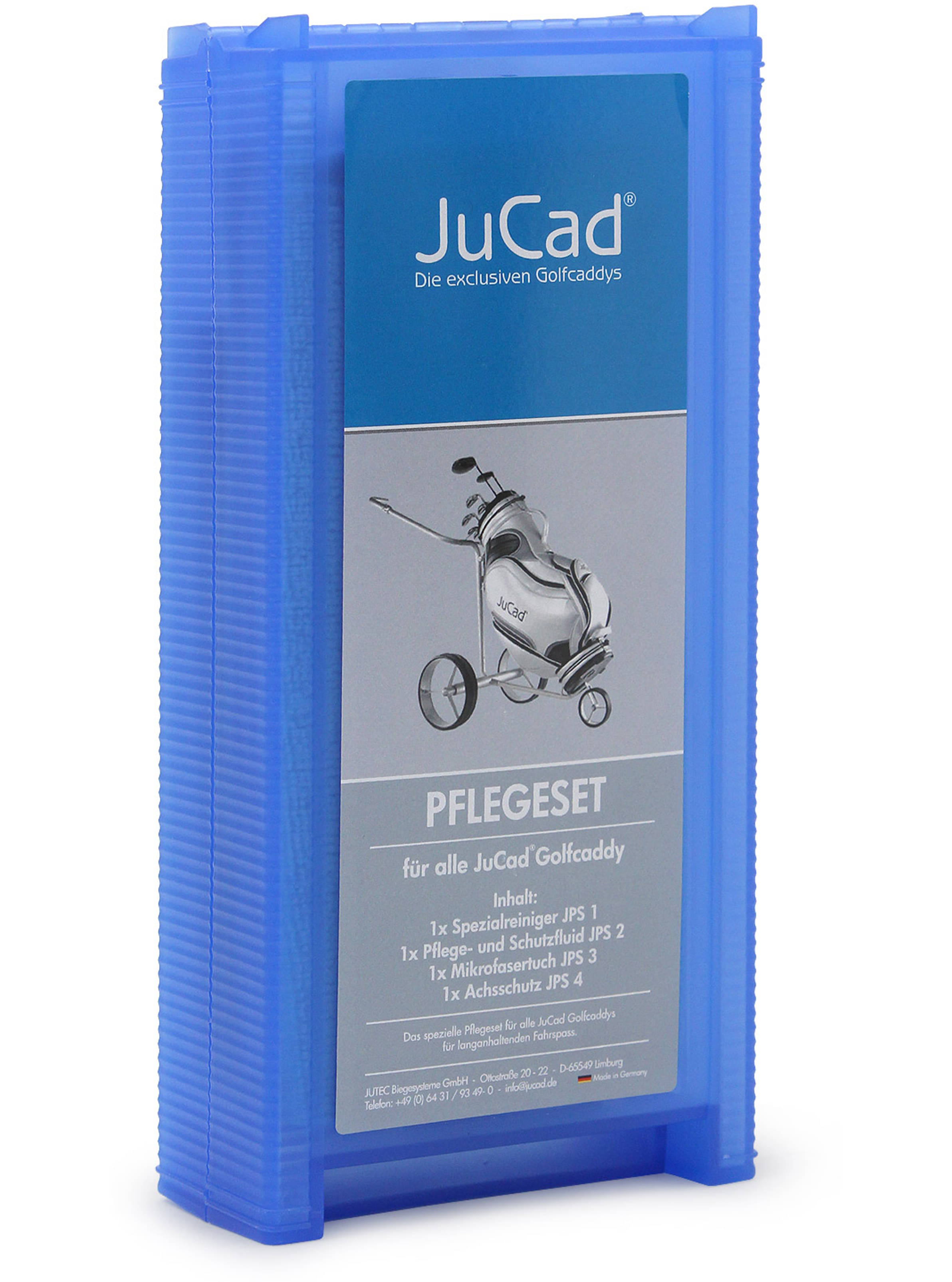 Pflegeset für alle JuCad Golf-Trolleys. Das Set enthält eine Flasche Spezialreiniger, eine Flasche Pflege- und Schutzfluid, ein Mikrofasertuch sowie einen Achsenschutz mit Reinigungsvlies. Der Spezialreiniger ist ein Aktivschaum-Spray mit hervorragender Reinigungswirkung zur Behandlung aller Oberflächen Ihres JuCad Trolleys, inklusive Rahmen, Felgen und Bereifung. Nach der Reinigung können Sie die Oberfläche und beweglichen Teile Ihres Trolleys zusätzlich mit dem JuCad Pflege- und Schutzfluid behandeln, um die Leichtgängigkeit der Räder und beweglichen Teile zu erhalten. Das Pflege- und Schutzfluid bietet hochwertige Oberflächenpflege mit Nanoeffekt. Inklusive einer praktischen Aufbewahrungsbox. Spezialreiniger: 200 ml Gefahr Extrem entzündbares Aerosol. Behälter steht unter Druck. Kann bei Erwärmung bersten. Darf nicht in die Hände von Kindern gelangen. Von Hitze, heißen Oberflächen, Funken, offenen Flammen sowie anderen Zündquellenarten fernhalten. Nicht rauchen. Nicht gegen offene Flamme oder andere Zündquelle sprühen. Nicht durchstechen oder verbrennen, auch nicht nach Gebrauch. Vor Sonnenbestrahlung schützen und nicht Temperaturen von mehr als +50°C aussetzen.Inhalt/Behälter in Übereinstimmung mit den lokalen/regionalen/nationalen/internationalen Vorschriften der Entsorgung zuführen. Enthält > 5 % nichtionische Tenside. Enthält 5 % und darüber, jedoch weniger als 15 % aliphatische Kohlenwasserstoffe. Achtung Nicht in die Augen, auf die Haut oder auf die Kleidung gelangen lassen. Enthält 5 % und darüber, jedoch nicht weniger als 15 % aliphatische Kohlenwasserstoffe. Enthält 15 % und darüber, jedoch weniger als 30 % nichtionische Tenside.