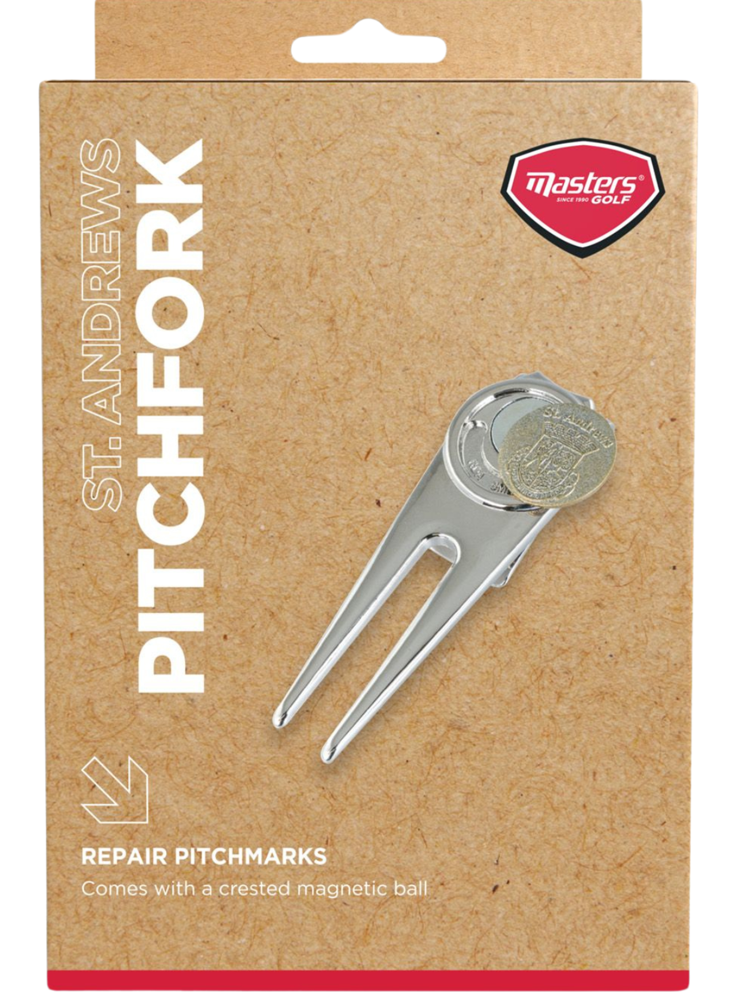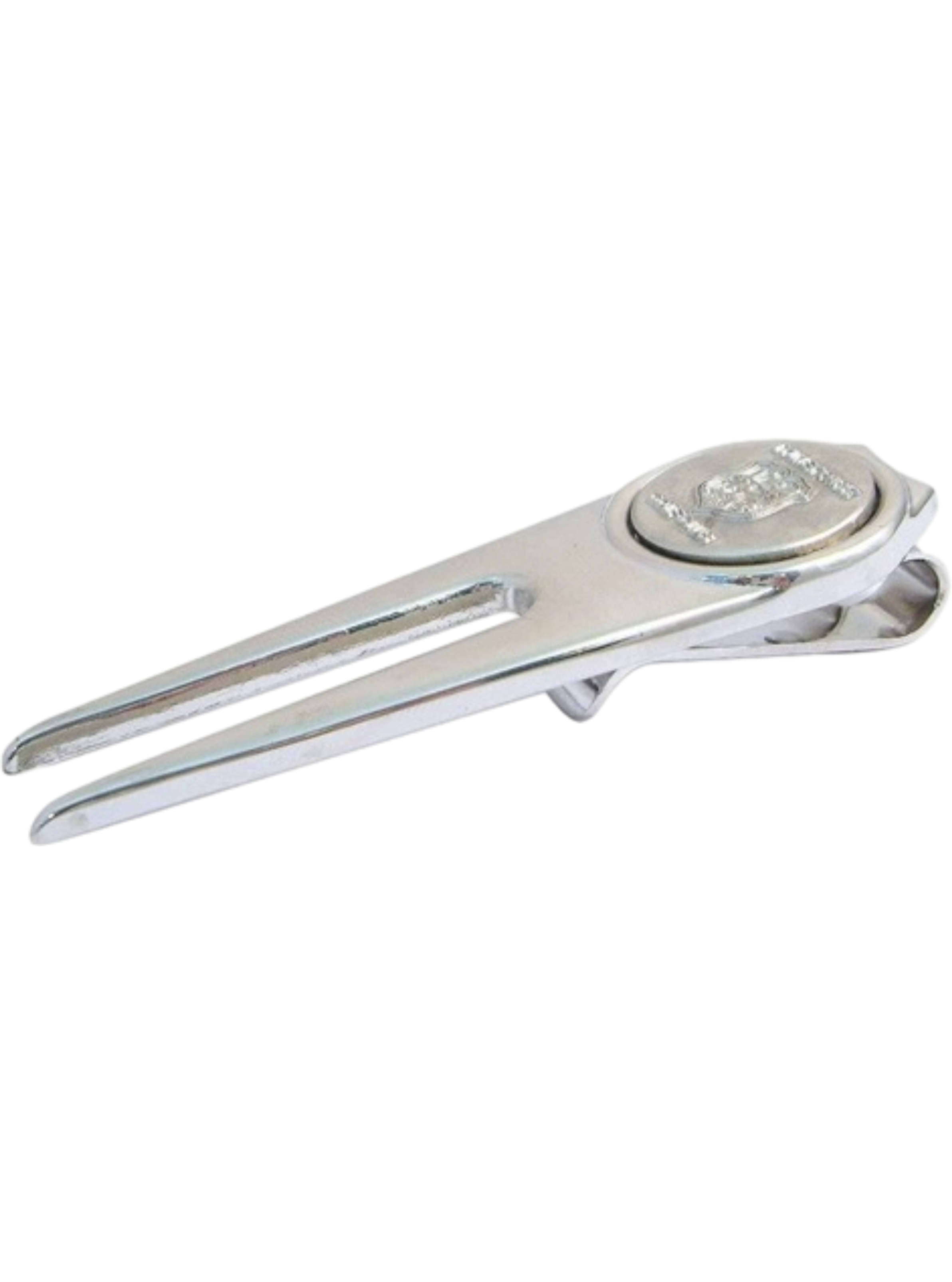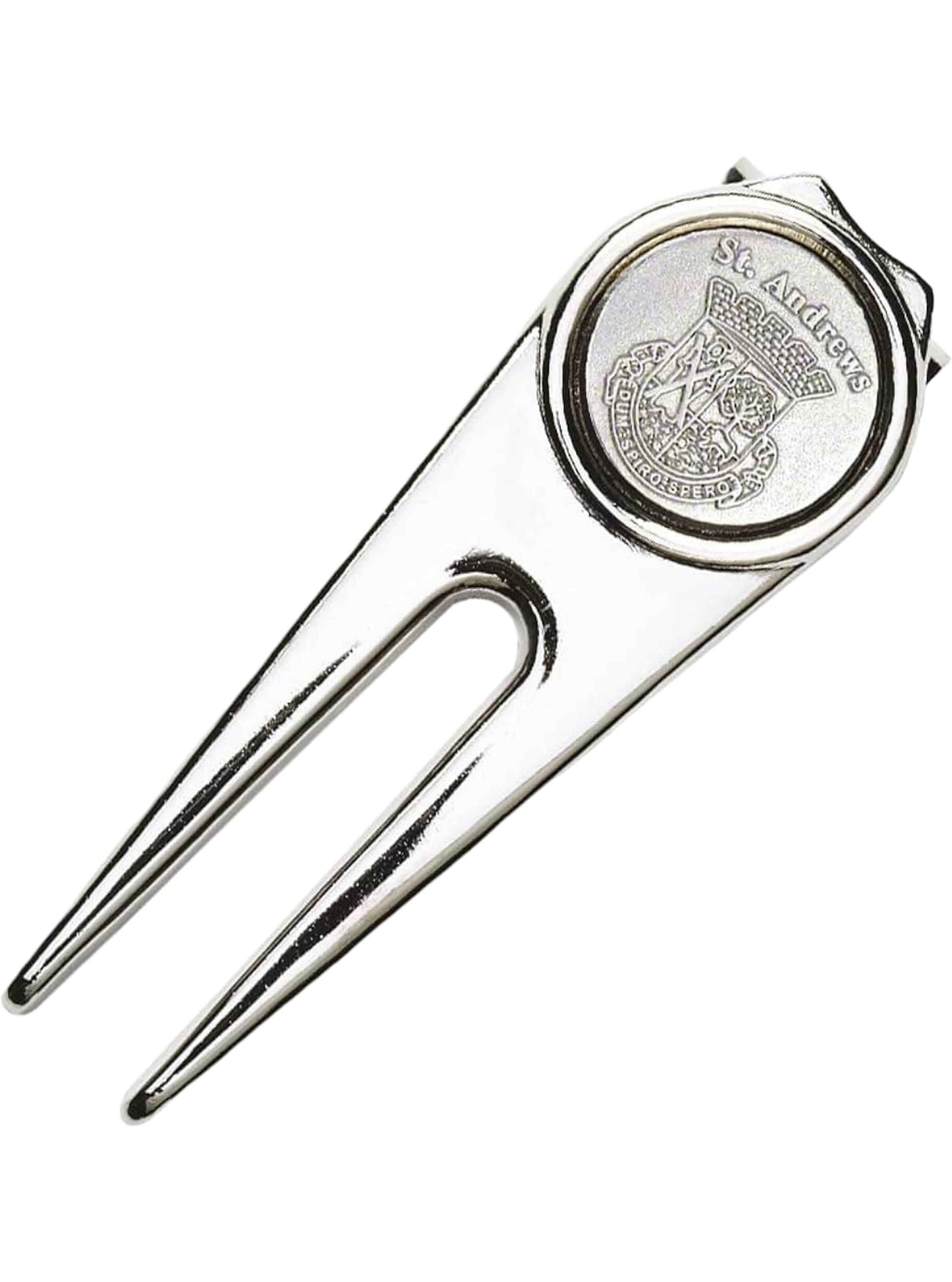 St. Andrews Pitchgabel aus Metall. Mit einem magnetischen Ballmarker mit St. Andrews Prägung und Clip zum Befestigen auf der Rückseite.