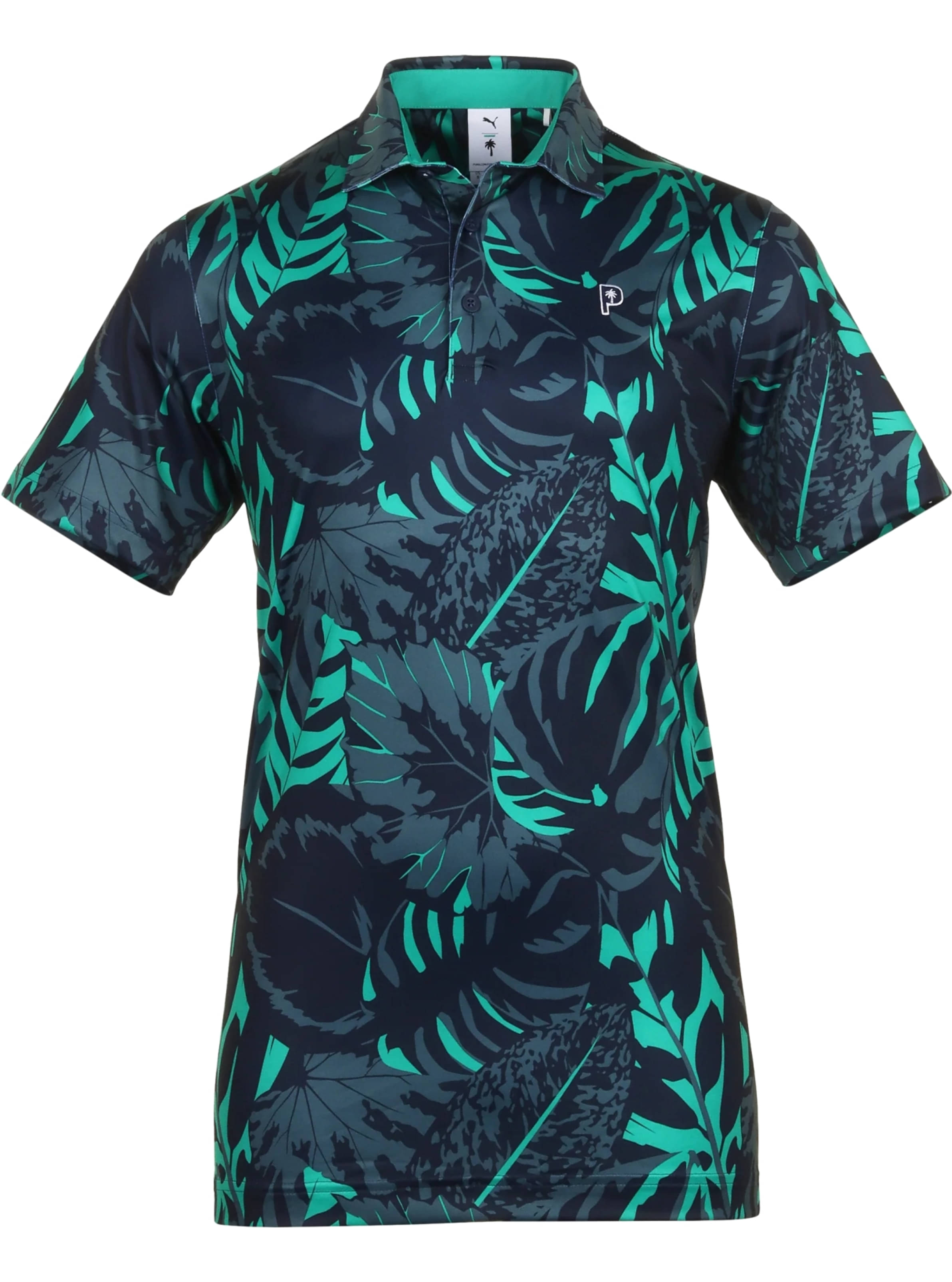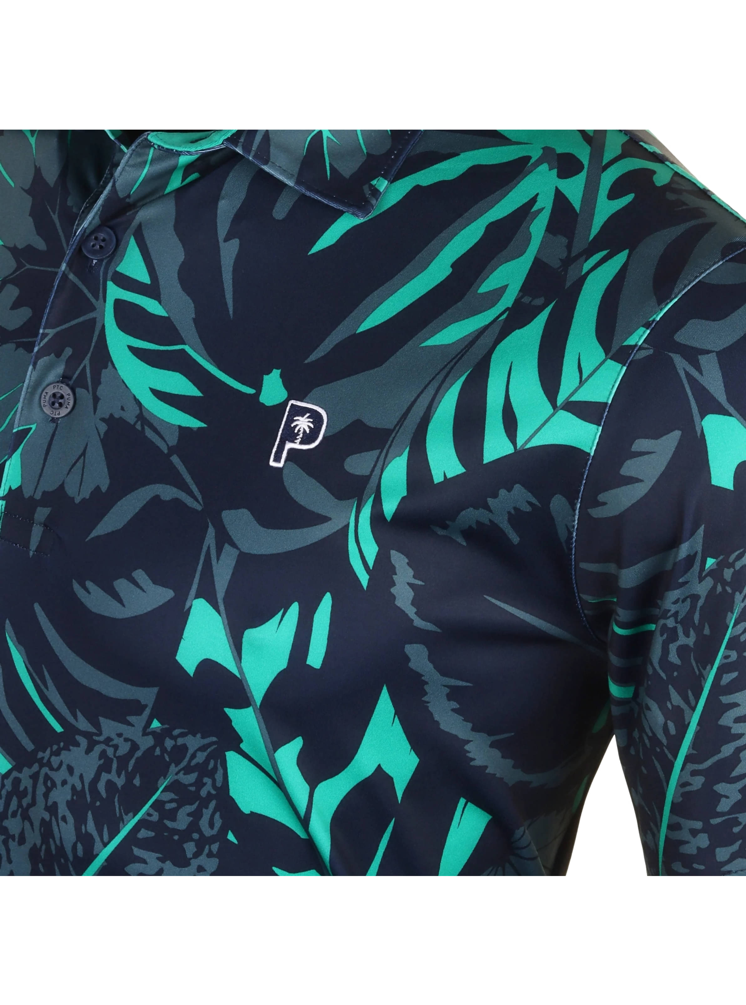 Das Material bietet 4-Wege-Stretch, ist leicht, ultraweich und atmungsaktiv. Es verfügt über einen selbsttragenden Kragen, eine Drei-Knopf-Knopfleiste und einen ganzflächigen Druck. Das Puma P x PTC Logo befindet sich auf der linken Brust.