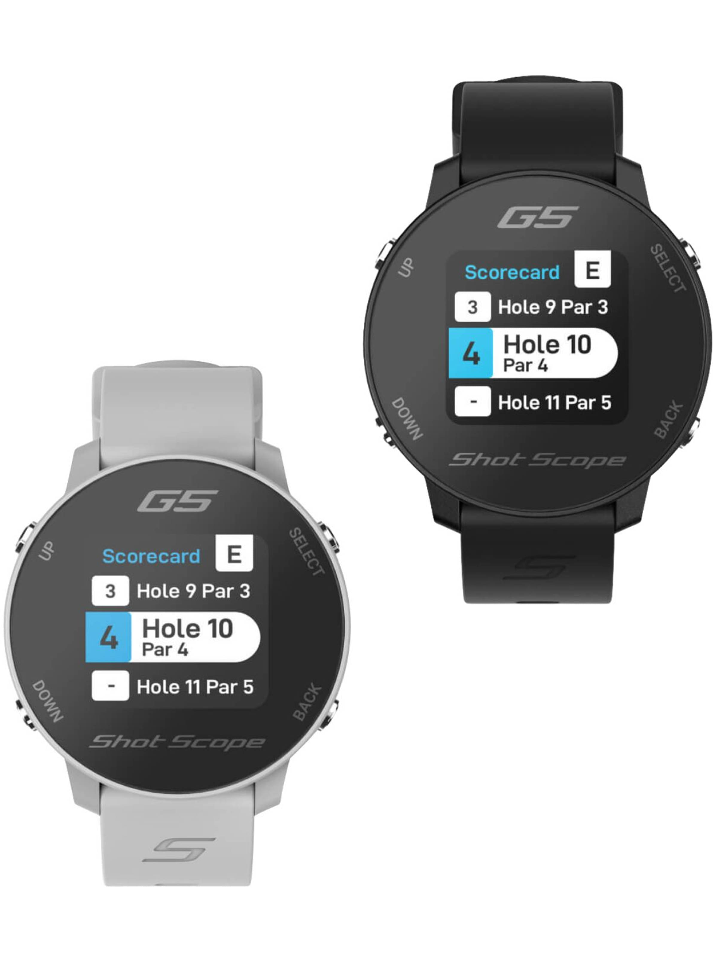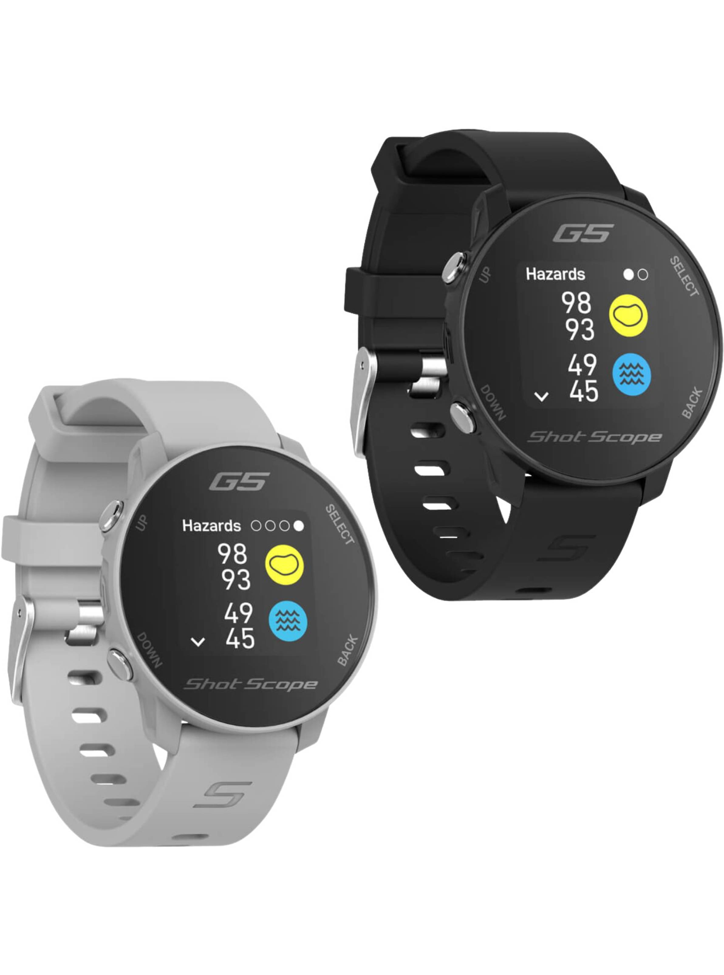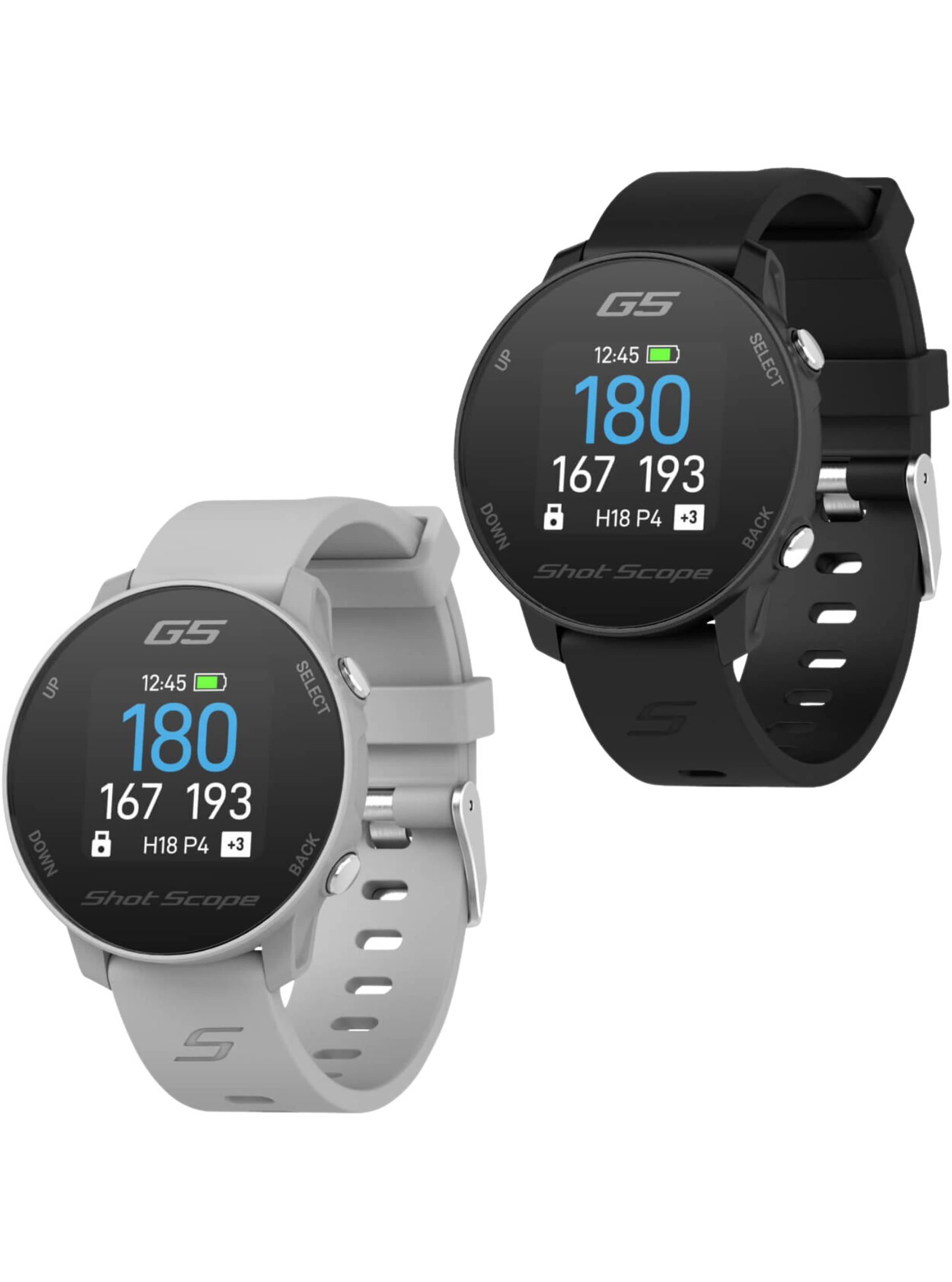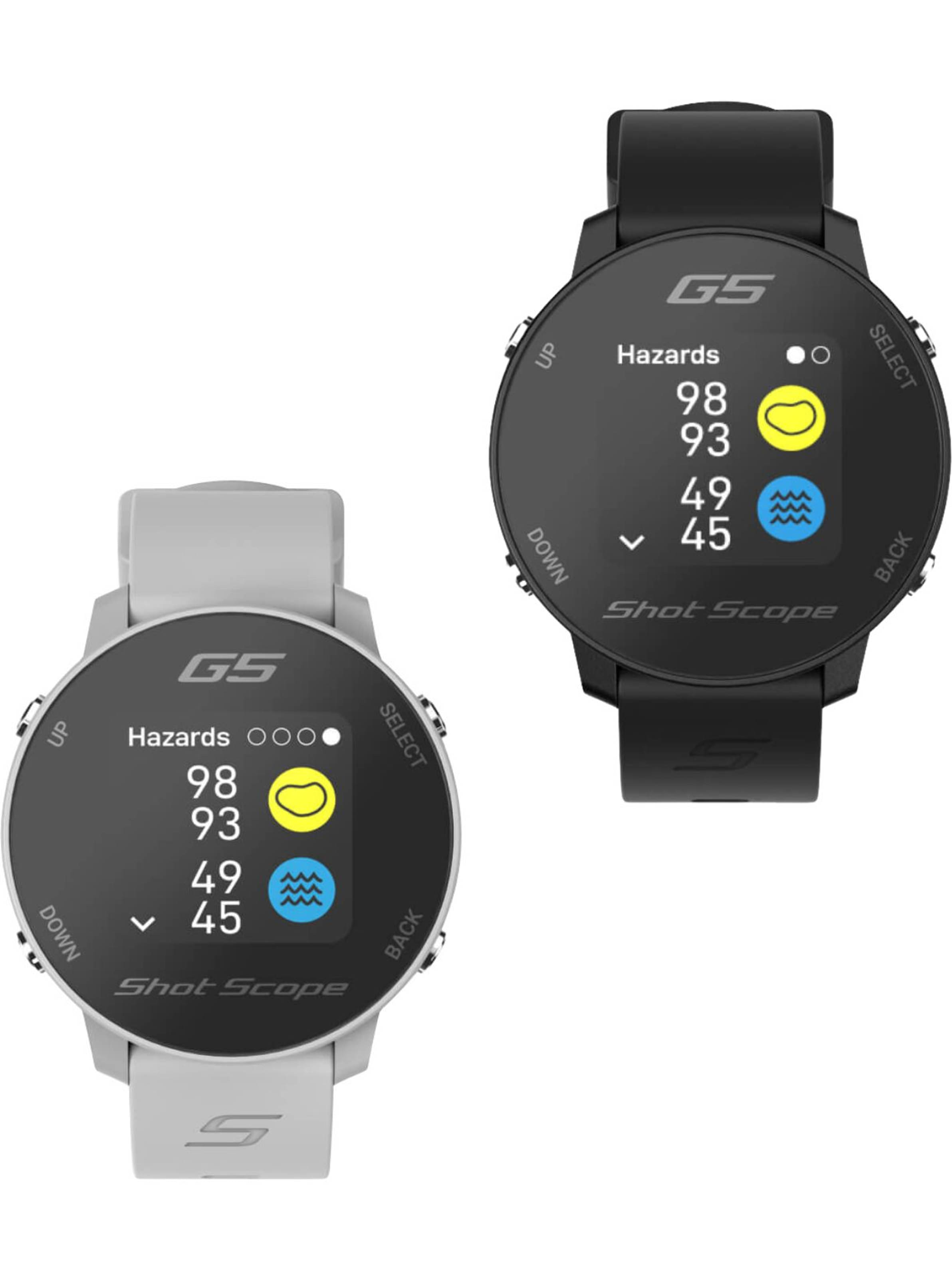 Der Shot Scope G5 macht es Golfern einfach, sich auf ihr Spiel zu konzentrieren und dabei genaue Entfernungen auf dem Platz zu erhalten. Ohne dass ein Telefon für die Einrichtung oder Nutzung auf dem Golfplatz benötigt wird, ist der G5 einfach zu bedienen und sofort einsatzbereit. Es handelt sich um eine präzise GPS-Uhr, die dynamische Entfernungen zum Vorder-, Mittel- und Hintergrund des Grüns sowie zu Hindernissen, Layup-Punkten und Hundeknie-Entfernungen liefert. Mit über 36.000 vorinstallierten Golfplätzen weltweit ermöglicht der G5 dem Golfer, für jedes Loch eine Strategie zu entwickeln und den richtigen Schläger auszuwählen. Die digitale Scorekarte hilft dabei, die Ergebnisse während der Runde im Blick zu behalten und wird klar auf dem tageslichttauglichen Farbbildschirm angezeigt. Als eine der leichtesten GPS-Uhren auf dem Markt beeinträchtigt sie nicht Ihren Schwung und ermöglicht es Ihnen, Ihr Bestes zu geben und Ihre Leistung zu erbringen. Was ist der Unterschied zwischen dem Shot Scope G5 und dem Shot Scope X5? Das X5 ist eine Touchscreen-Uhr, die als alltägliche tragbare Uhr sowie als Golf-Leistungsverfolgungsuhr konzipiert ist, während der G5 sich ausschließlich auf Golf konzentriert und keine Leistungsnachverfolgung durchführt. Der G5 ermöglicht es den Benutzern auch, ihren Stil mit den austauschbaren Bändern zu variieren und verwendet Tasten zur Navigation anstelle eines Touchscreens. Eigenschaften:- Schnelle Einrichtung, sofort spielbereit