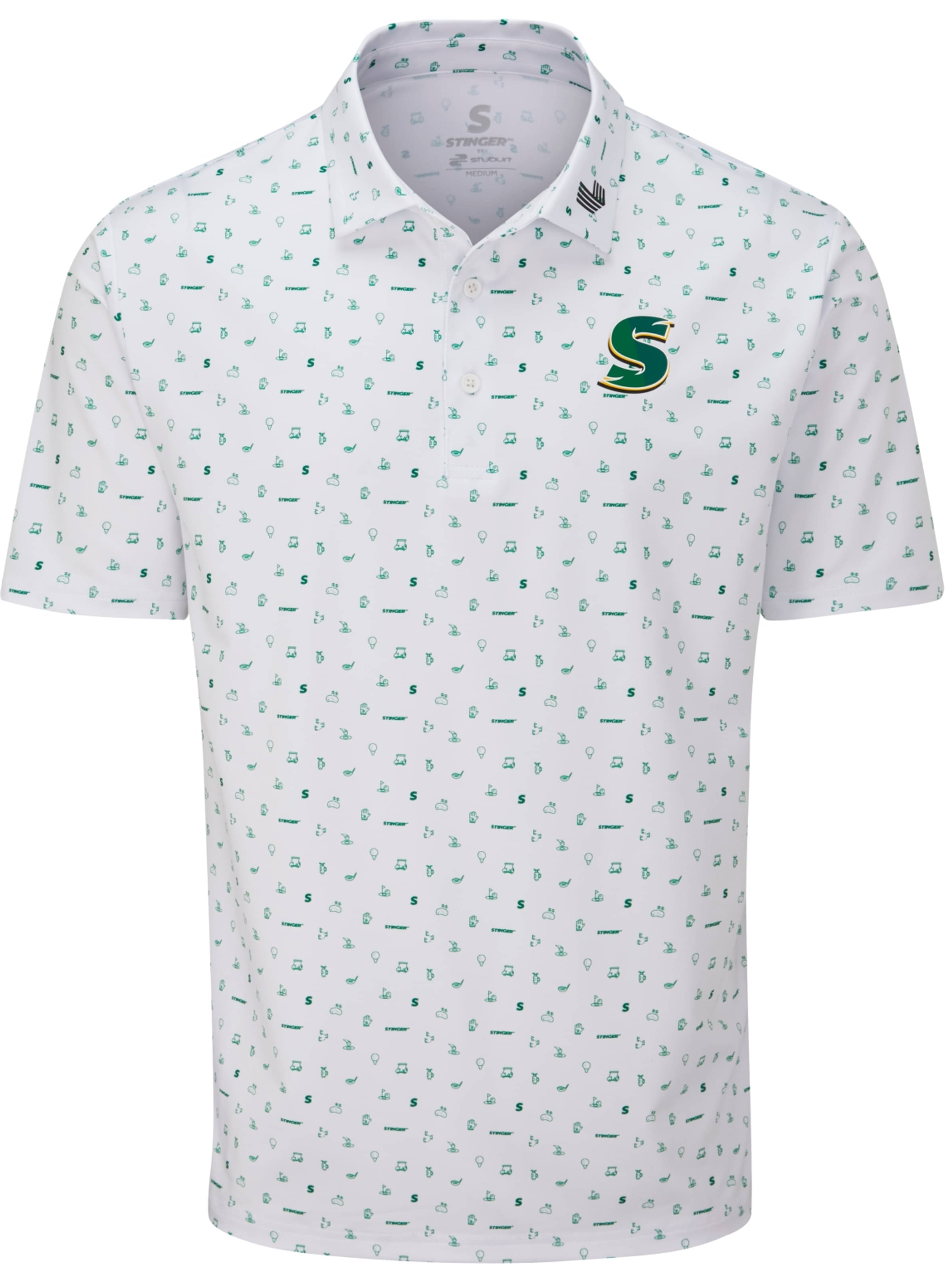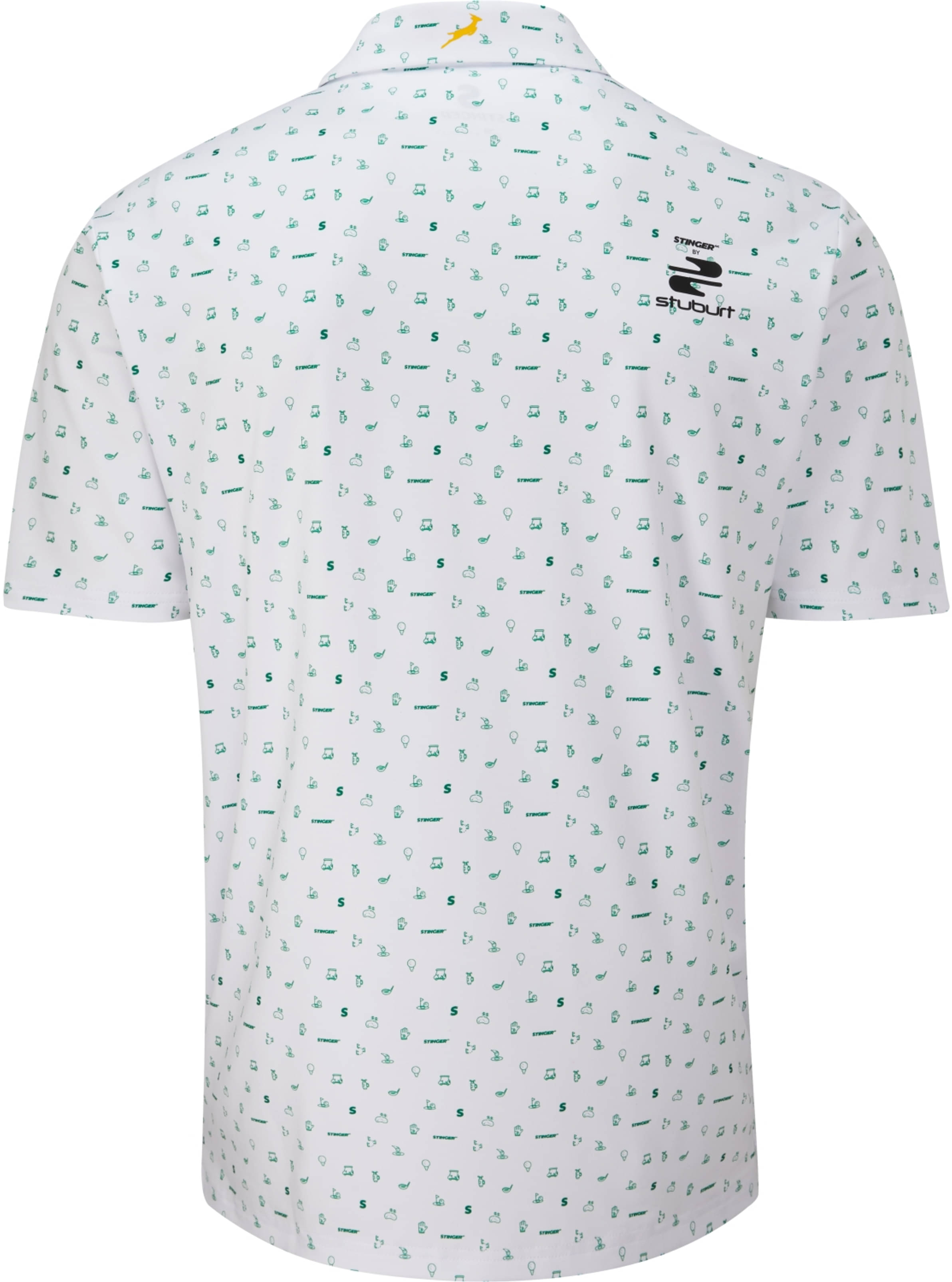 In diesem Polo mit Rapportmuster, das unter anderem das S-Logo, die Stinger-Wortmarke, einen Buggy, eine Golftasche, einen aufgeschlagenen Ball und eine Pin-Flagge enthält, kommen die Stinger-Team-Persönlichkeiten und ihre Liebe zum Golfsport zum Ausdruck. Das Muster ist ein echter Hingucker. Der Stoff ist leistungsstark und bequem, egal wie heiß es auf dem Platz wird.