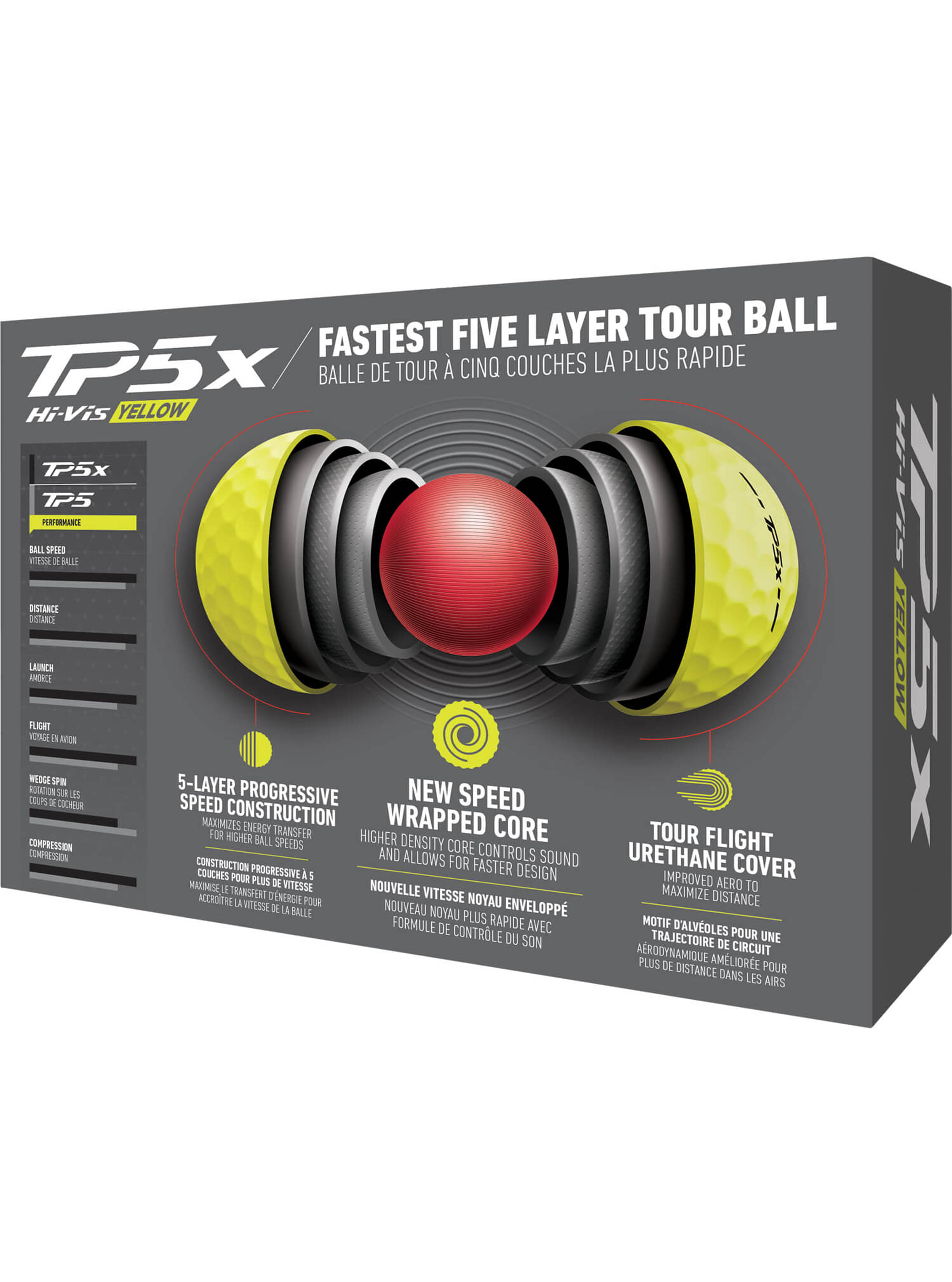 Neuer Speed-Wrapped-Kern Ein neuer, weicherer Klang bei schnellerem Design. Neuer progressiver 5-Lagenaufbau Unser größter Geschwindigkeitsgradient optimiert die Spin-Trennung zwischen Driver/langen Eisen (geringer Spin) und Wedges (hoher Spin). Neue Cover-Designs weiss auf weiss und gelb auf gelb Neues eingefärbtes Urethan zur Verbesserung der Farbwahrnehmung und Haltbarkeit. Spezifikationen: