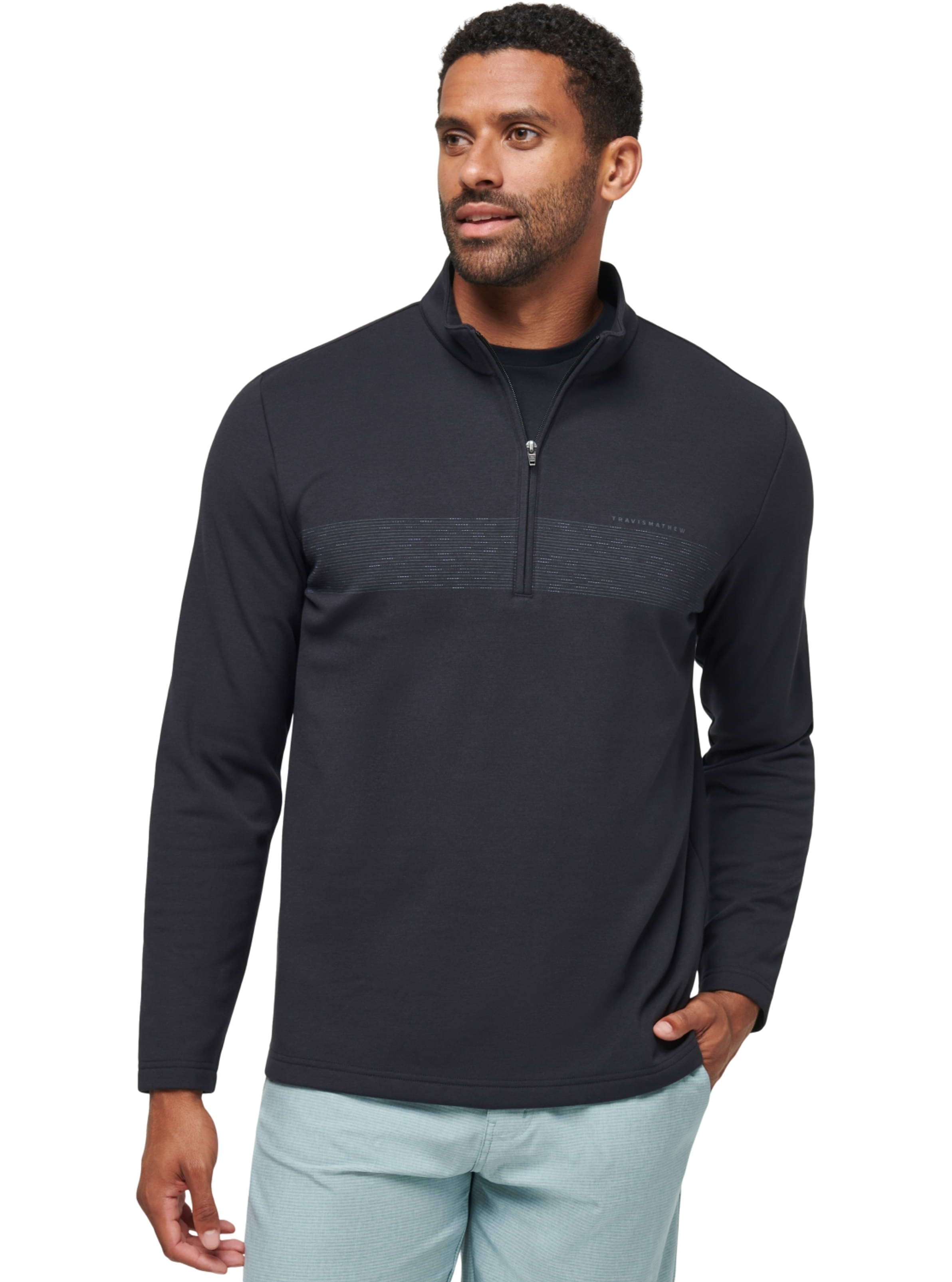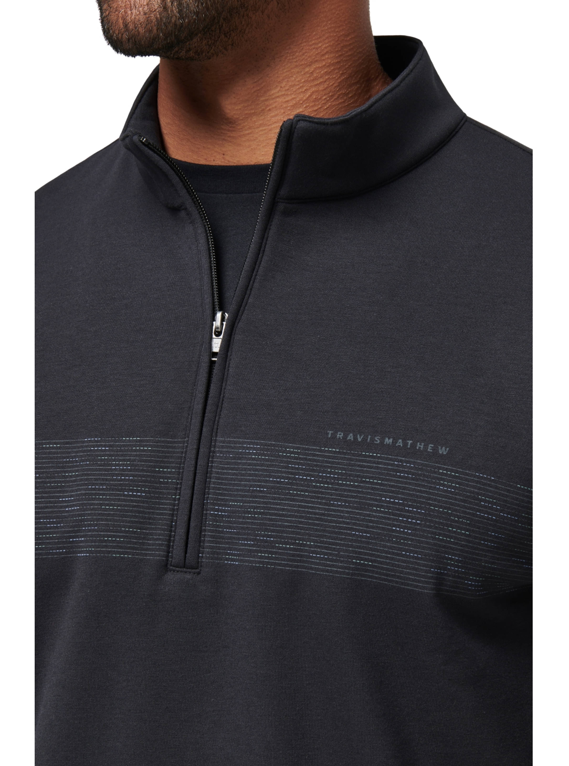 Der TravisMathew Upgraded Fleece Chest Stripe Quarter Zip Golfpullover präsentiert ein stylisches Brustdruckdesign. Er besteht aus feuchtigkeitsableitendem 4-Wege-Stretchmaterial und bietet ganztägigen Komfort und volle Bewegungsfreiheit.