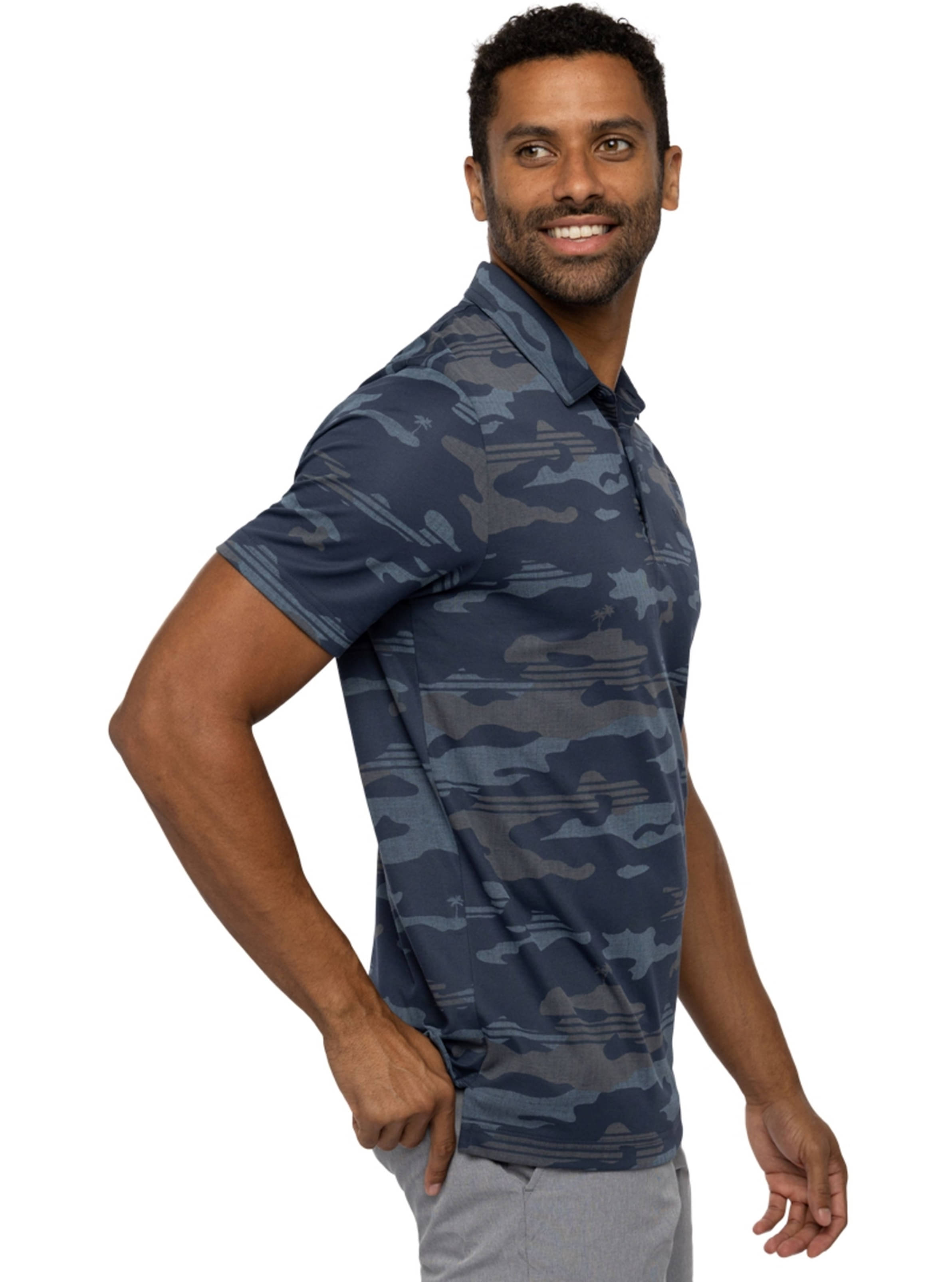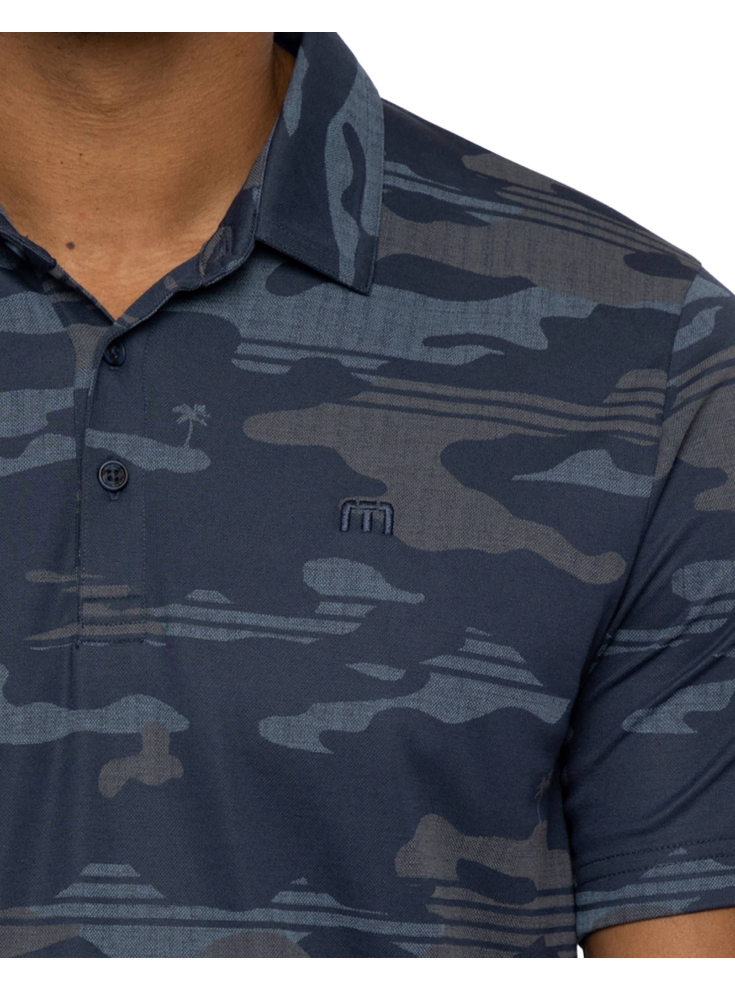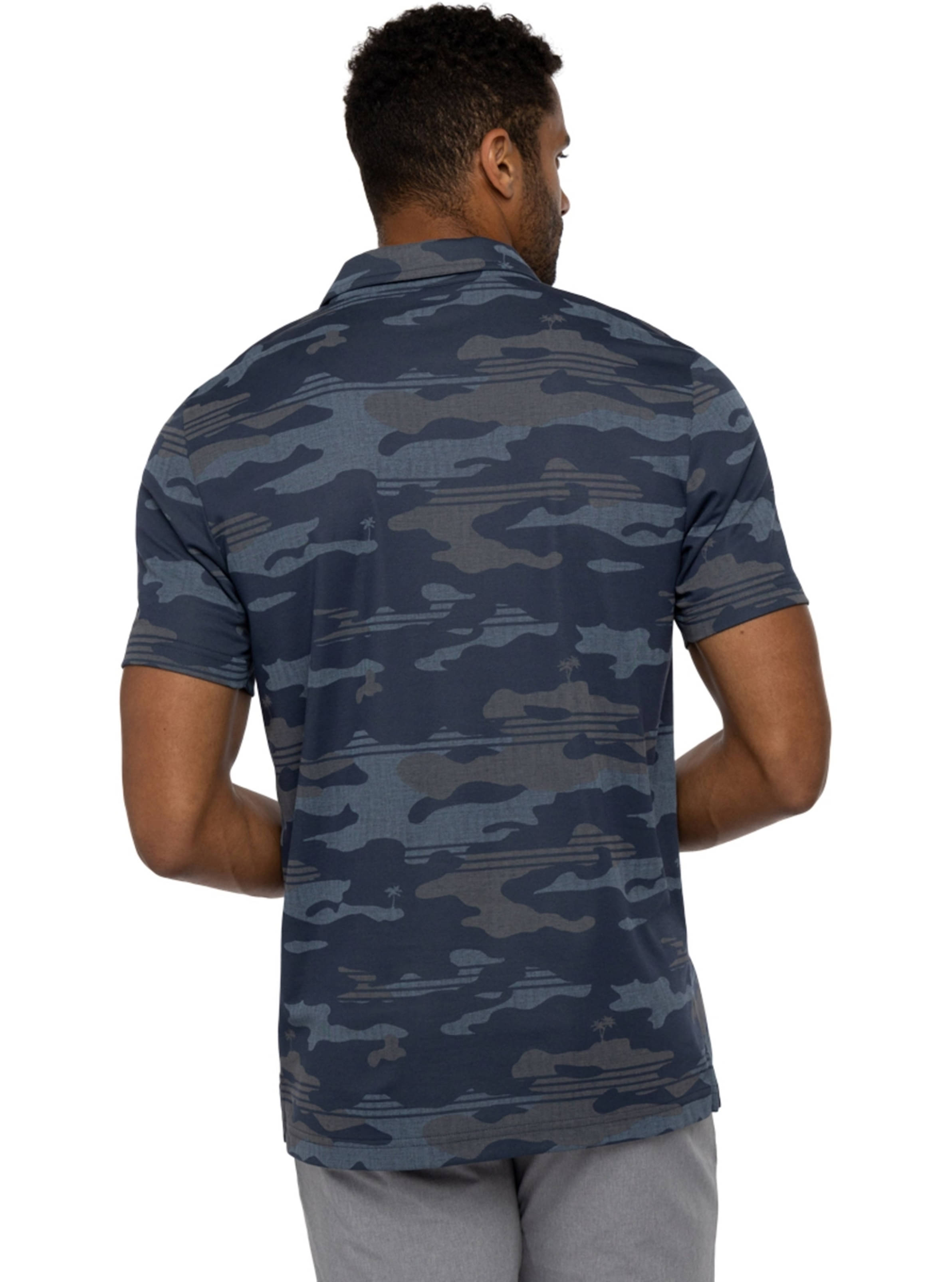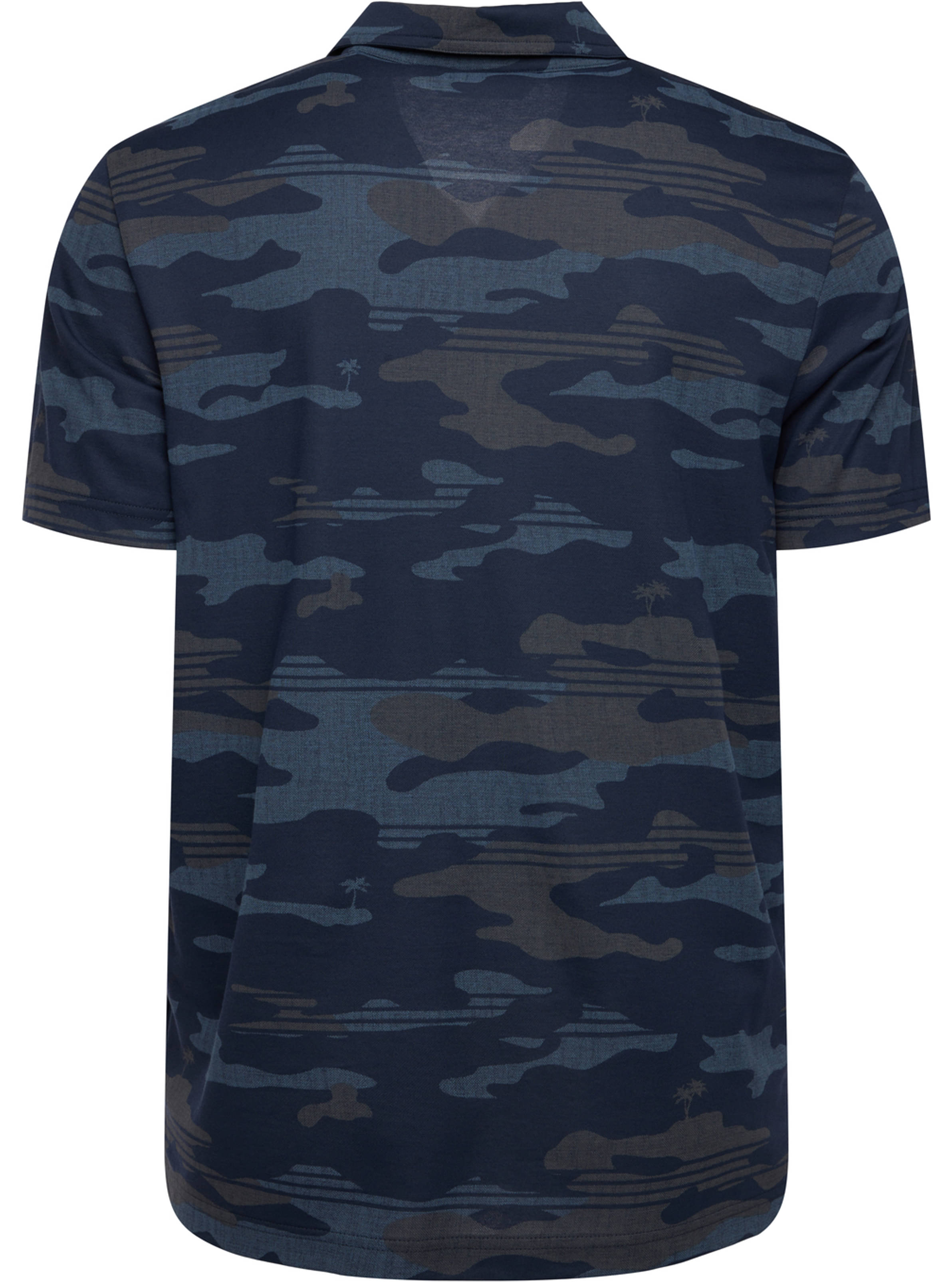 Das BEACHSIDE STEALTH Polo aus unserer Eco-Faser ist mit einem Camo-Muster und versteckten Palmen versehen, die mit einer Textur überzogen sind, die für einen lässigen, tragbaren Look sorgt.
